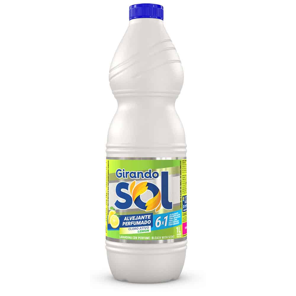 Na limpeza de pias, limpeza de cerâmicas e azulejos, misture 1 copo (200 ml) de Alvejante Girando Sol para 10 litros de água. Em superfícies encardidas usar 1 copo para 5 litros de água.