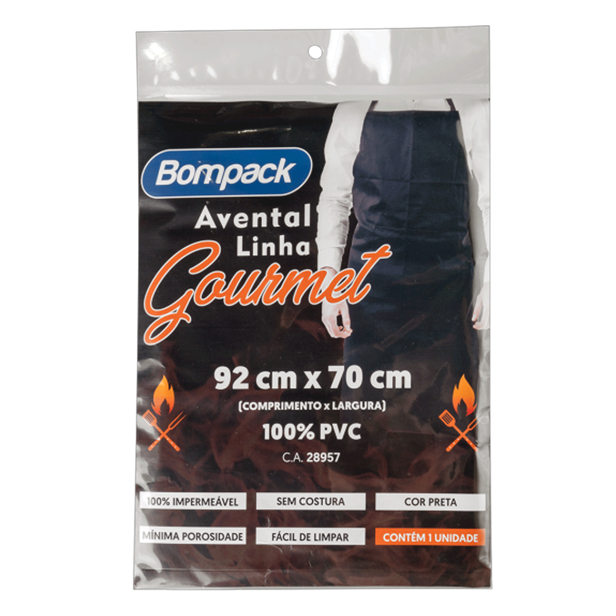 Avental produzido 100% em PVC da marca Bompack, com tamanho 92x70cm e contendo 12 unidades por embarque.