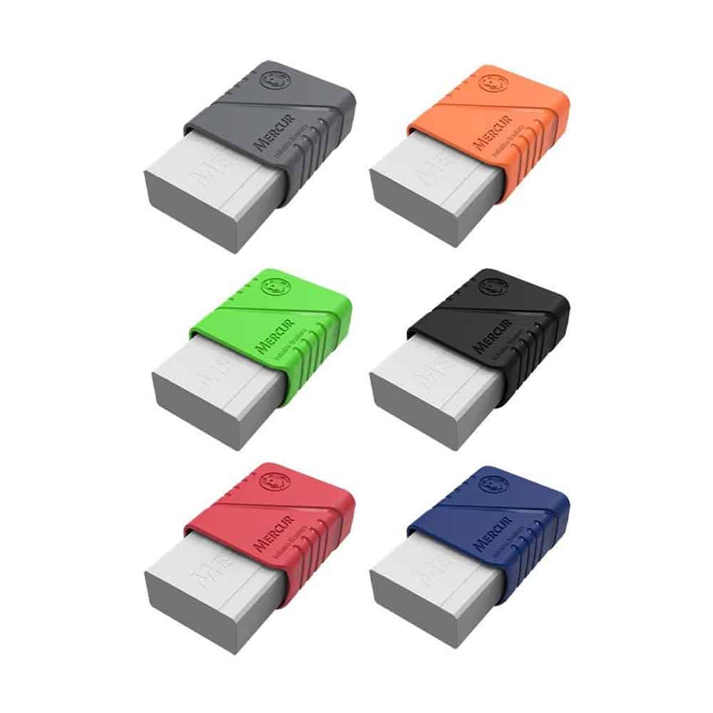 A Borracha plástica branca, com protetora colorida, é uma proteção que se adapta às mãos e protege contra a sujeira. As borrachas Mercur são resistentes à dobra e não quebram facilmente. Devido a sua borracha natural, não mancham o papel.