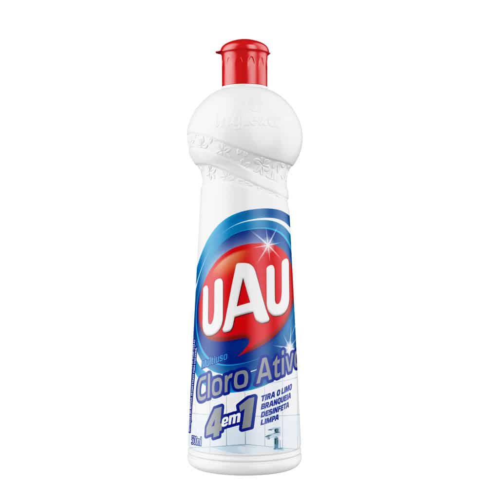 UAU Cloro Ativo Squeeze Ação 4 em 1 limpa, branqueia, desinfeta e remove o limo. Ele te ajuda a limpar manchas de mofo e limo e ainda mata germes e bactérias.
