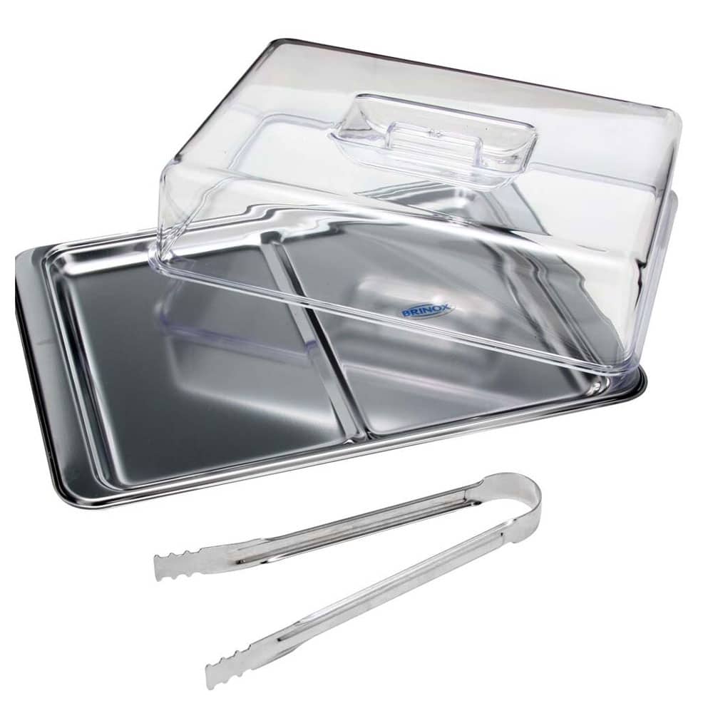 Medidas: Bandeja 27cm x 18,5cm / cúpula 23cm x 18cm x 5,8cm / pinça para frios 16,5cm x 1,5cm