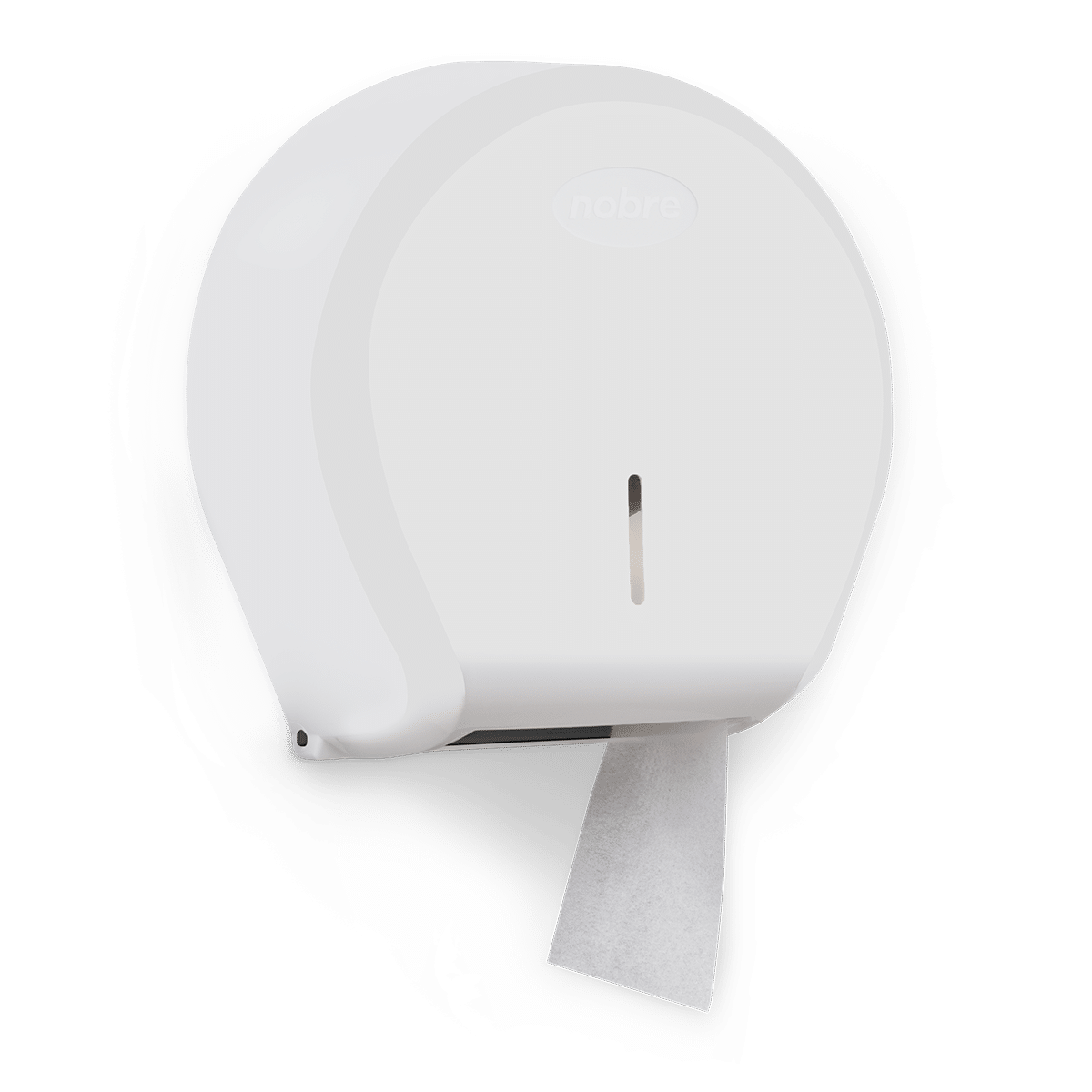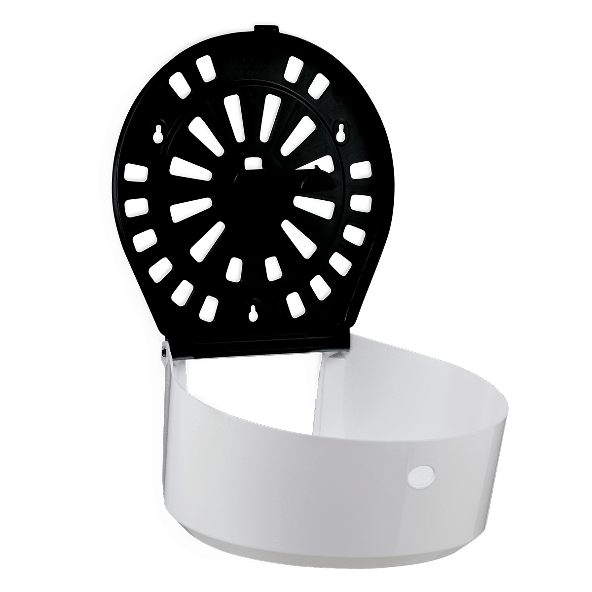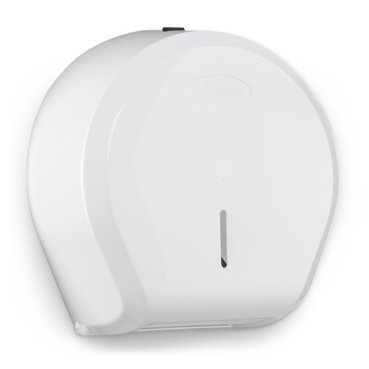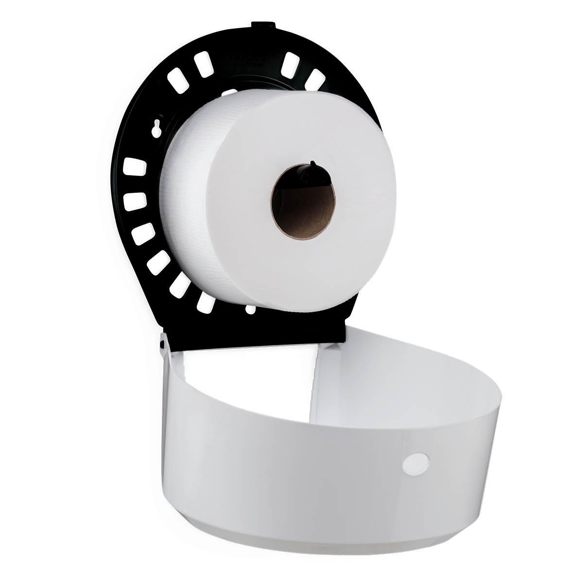 Pressione o botão para abrir. Abra com cuidado, puxando a parte frontal para a frente e para baixo. Fixe o dispensador na parede utilizando os parafusos que o acompanham. Abasteça com papel higiênico rolão, feche o dispensador e pronto!