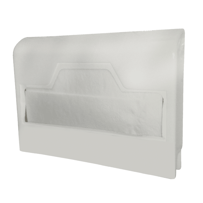 Suporte para refil de protetor de assento sanitário em plástico branco.