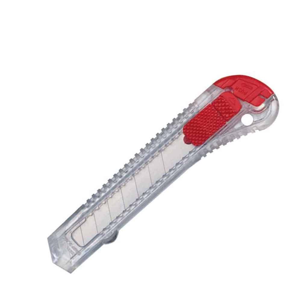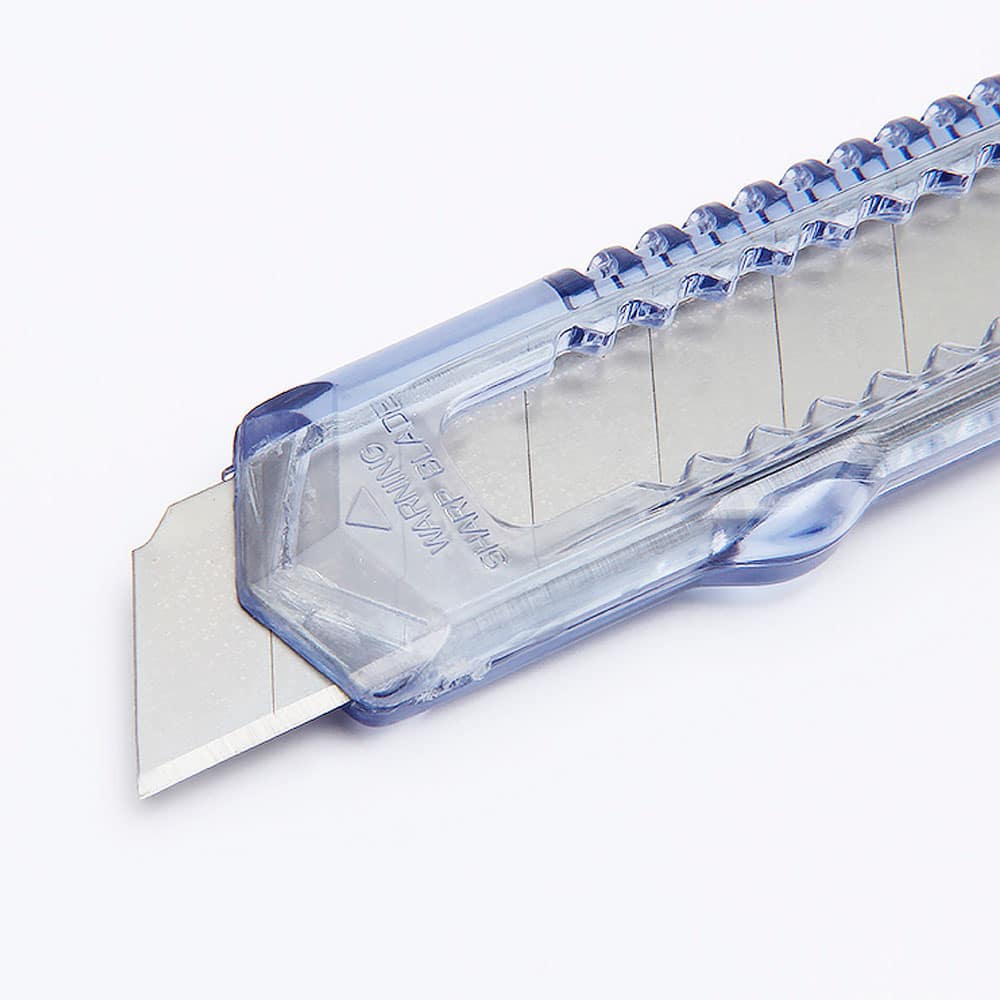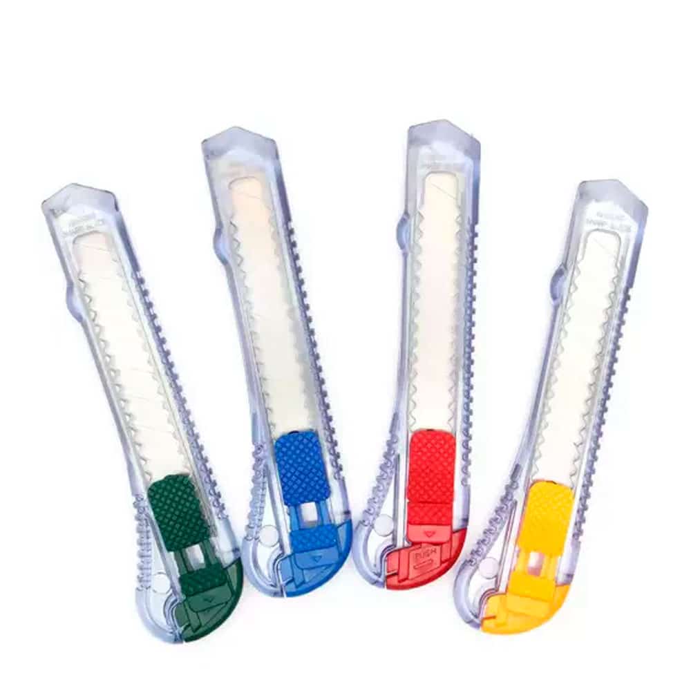 Estilete transparente; Lâmina larga; Ideal para profissionais que utilizam estilete no dia-a-dia para trabalhos manuais.