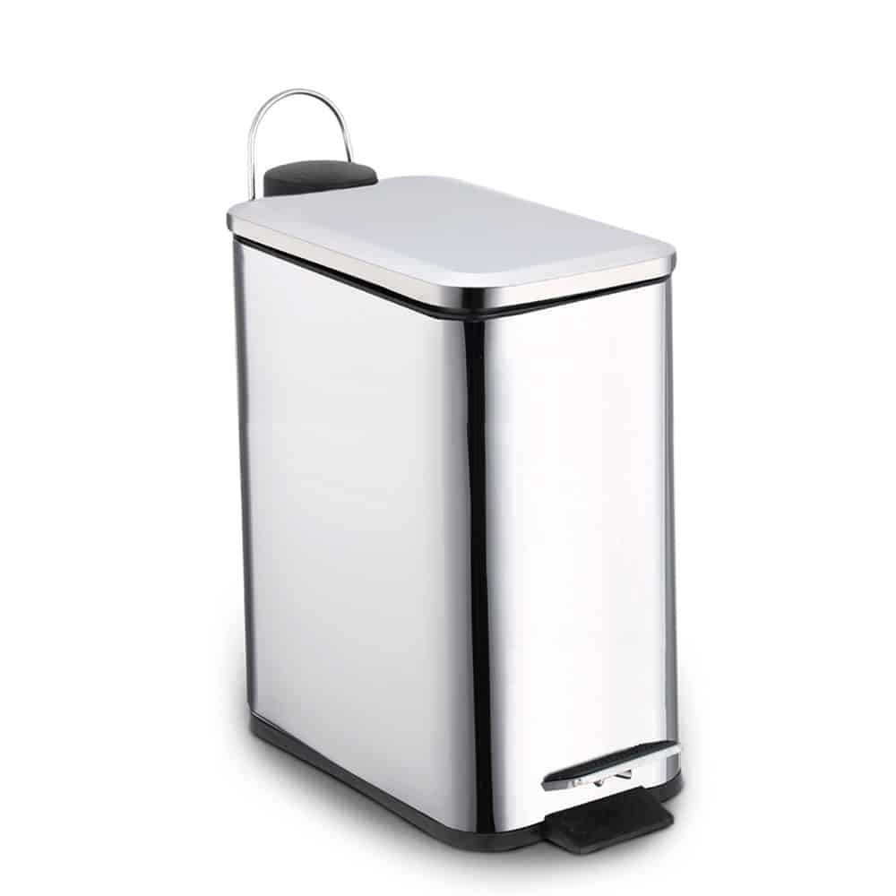 Lixeira slim em inox, com pedal e tampa articulável, com capacidade de 5 litros.