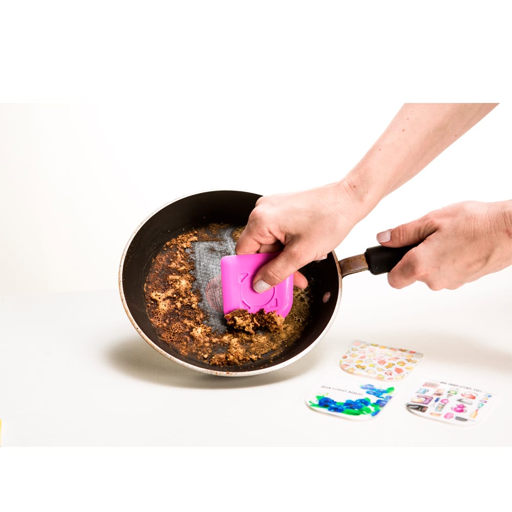 RASPA TUDO é um removedor de resíduos que não risca ou danifica nenhum tipo de superfície. Ideal para remover resíduos de frigideiras, panelas, formas antiaderentes, grills, automóveis, vidros e muito mais. O RASPA TUDO possui 4 cantos diferentes e laterais retas, o que lhe permite alcançar os cantos de difícil acesso.