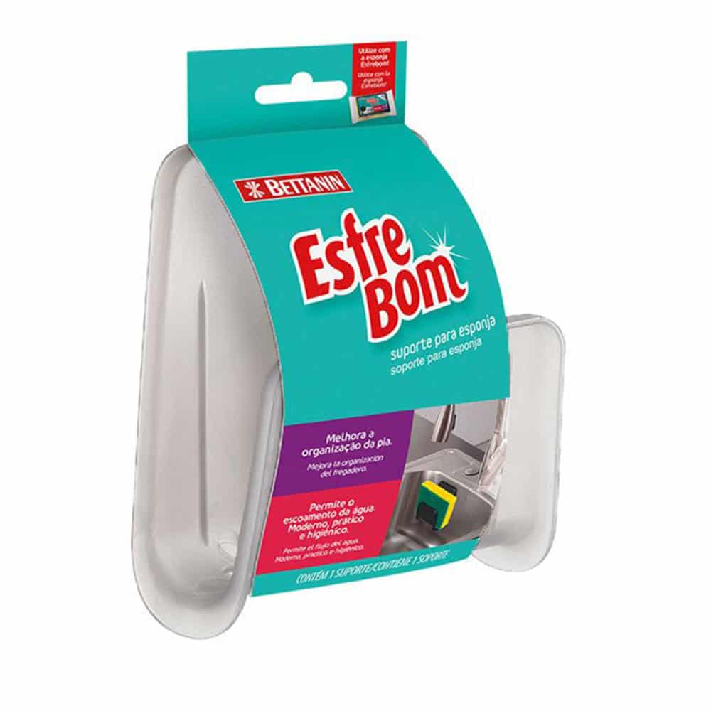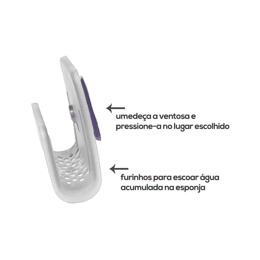 O suporte possui furinhos para escoar a água acumulada na esponja,