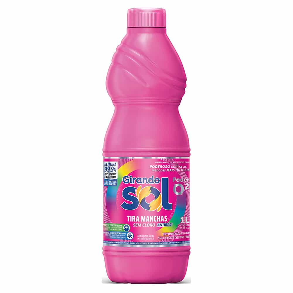 O Tira Manchas Sem Cloro Girando Sol é um produto de múltiplo uso, atuando como alvejante, tira manchas e ação bactericida (ANTIBAC Elimina 99,9% dos germes e bactérias). É eficaz na remoção de manchas difíceis durante o processo de lavagem. Deixa o branco mais branco sem danificar os tecidos e as cores. Usa como ativo o peróxido de hidrogênio. Produto testado contra os seguintes microrganismos: Staphylococcus aureus e Salmonella Choleraesuis.