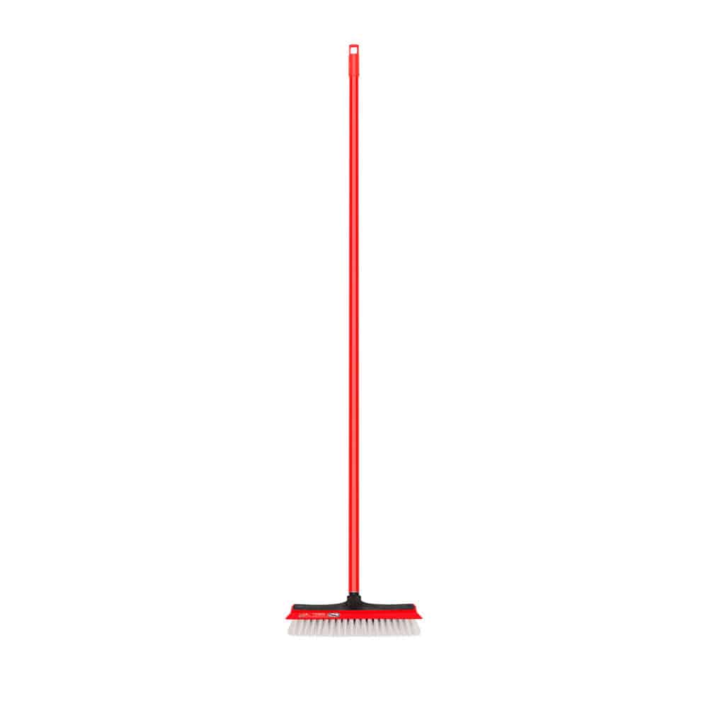 Produto 2 em 1, com escovão e rodo. Ideal para esfregar pisos. Cerdas resistentes Cor: Vermelha e Cinza Rodo de Borracha